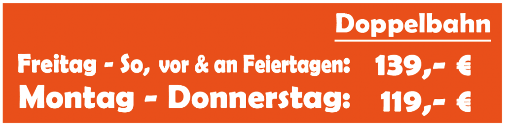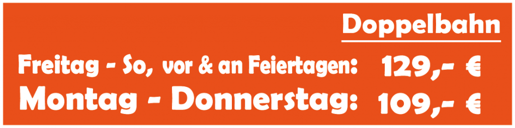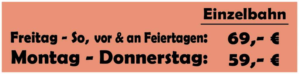 - Ab der 7. Person: +5 Euro pro Person (max. 8 Personen pro Bahn).