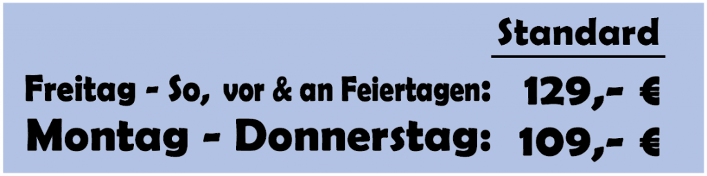 - Späteste Anfangszeit für das Standard Paket ist um 18:00 Uhr und für das Premium Paket um 17:00 Uhr.