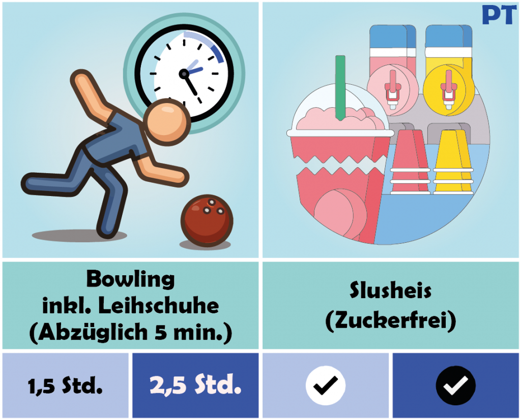PT = Pro Teilnehmer. PB = Pro Bahn. Änderung vorbehalten. Planet Bowl Leer August 2025