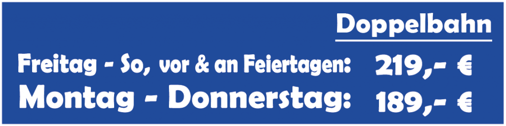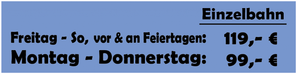 - Ab der 7. Person: +10 Euro pro Person (max. 8 Personen pro Bahn).